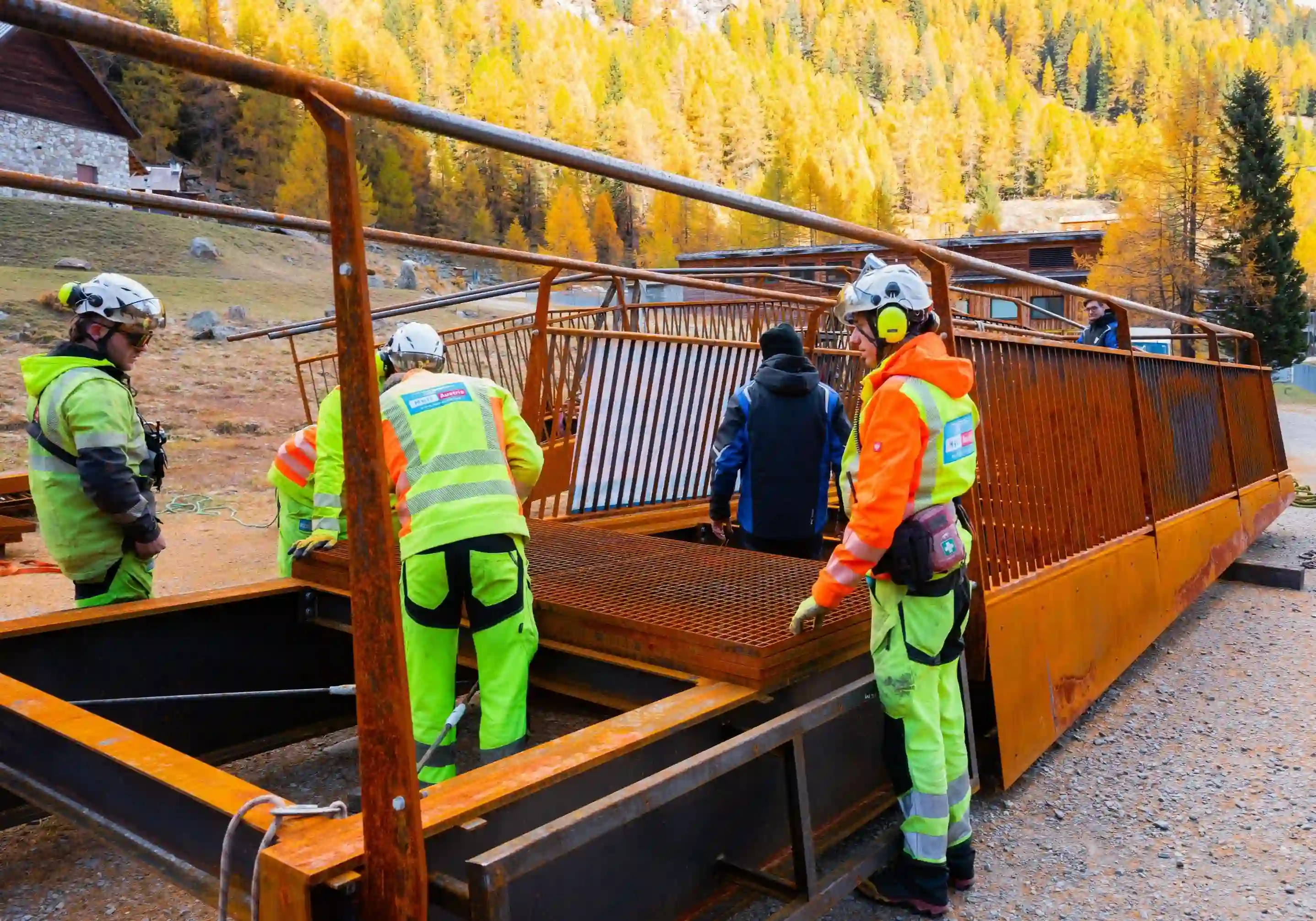 Montage einer Brücke und Aussichtsplattform aus Cortenstahl | Stausee Weißbrunn, Ultental (Südtirol)